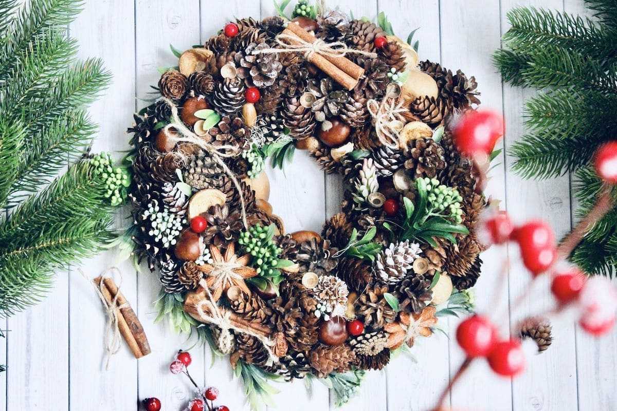 Самый простой способ сделать венок из веток ели и шишек – соединить их с заранее подготовленным круглым каркасом из металлической проволоки