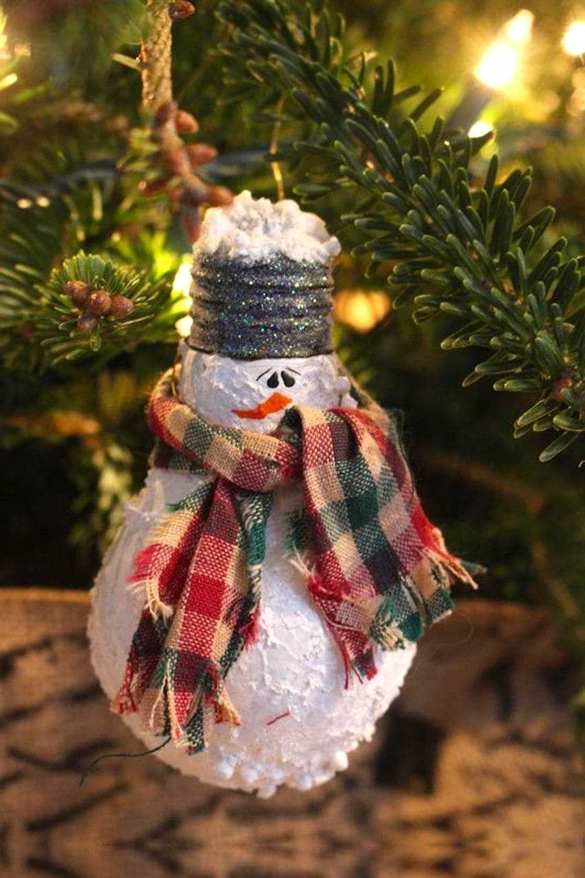 В завершение с помощью кисточки, красок и, конечно же, вашей фантазии разрисуйте получившуюся поделку. Чтобы снеговик красовался на новогодней елке, в шапку (еще до того, как снеговик будет просушен) нужно воткнуть булавку с ленточкой. Это будет оригинальная игрушка на Новый год своими руками, которая точно будет выделяться на фоне покупных шаров и мишуры.
