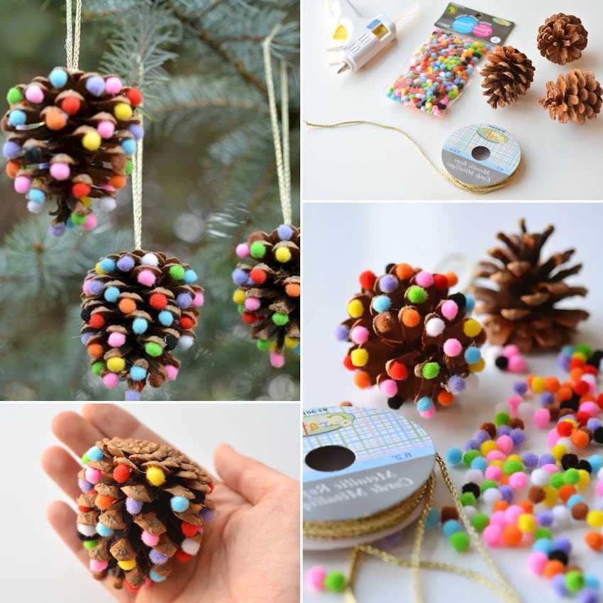 Разноцветные шарики из фетра можно приклеить к раскрытым лепесткам сосновой шишки, тем самым вы получите оригинальное украшение для новогодней елки