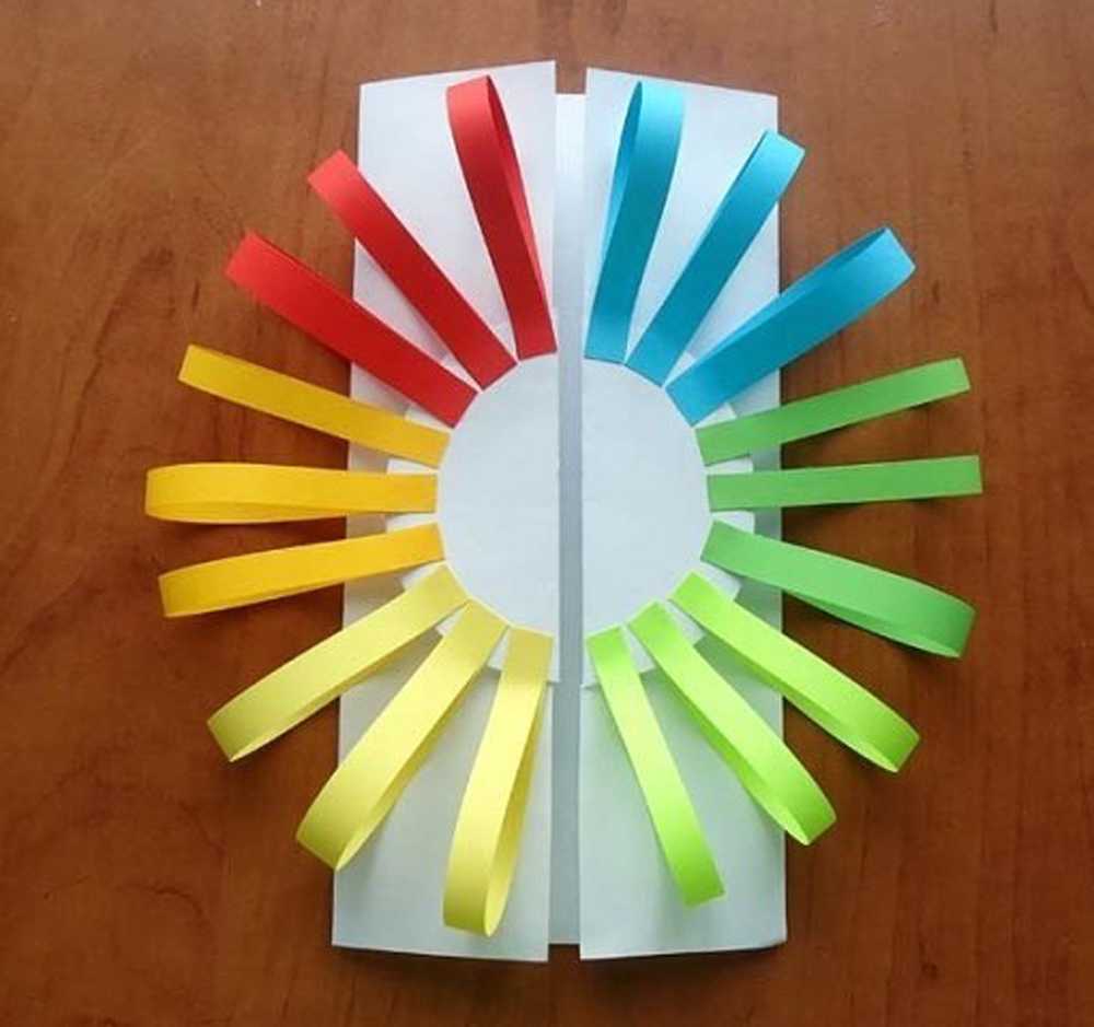 - Нарезать из цветной бумаги полоски длиной примерно 20-25 см. и шириной около одного сантиметра — это лучи.