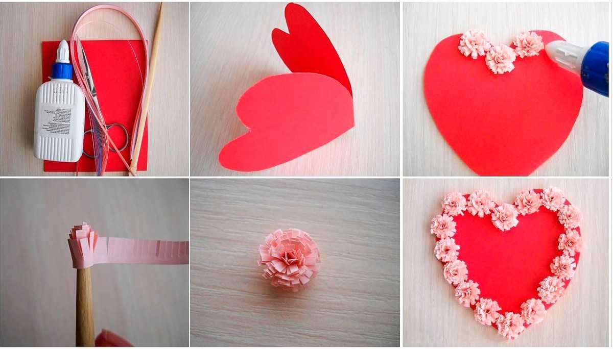 Простая открытка с добрым поздравлением станет достойным подарком маме от ребенка. Берут белый лист плотной бумаги, складывают пополам, а в верхней части вырезают окошко в виде сердца — для этого понадобится канцелярский нож или маленькие кривые ножницы (типа маникюрных). Сердце по краю оклеивают каймой из цветной бумаги: кайму можно вырезать фигурными ножницами.