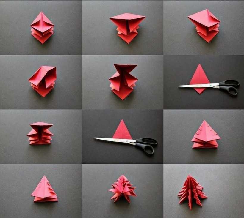 Скромная елка оригами складывается из одностороннего листа цветной бумаги. Так как эта елочка ничем особенным не блещет, придайте ей изящество и блеск красивым материалом.