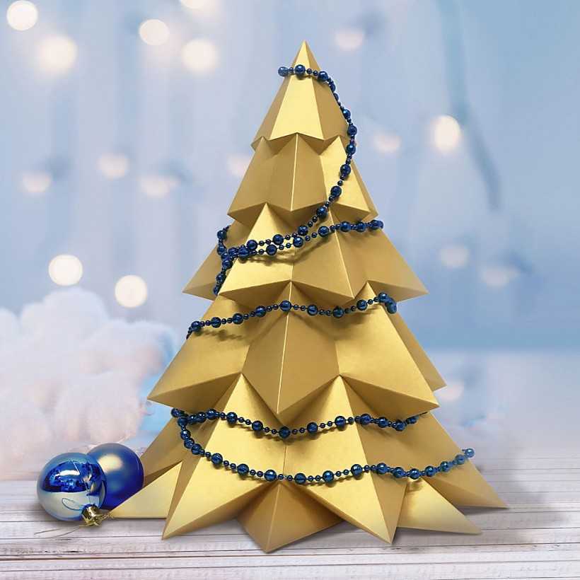 Остаётся только выровнять стороны новогодней пирамидки, чтобы она была симметричной. При необходимости, ещё на стадии складывания внутрь заводят нитку с узелком для крепления на ёлку.