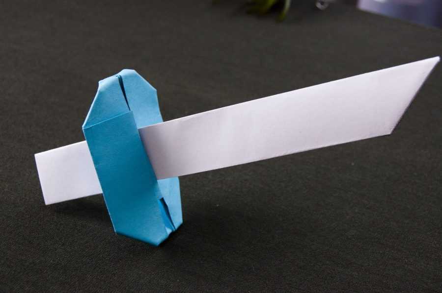 - Загнуть верхний и нижний срез, сложить пополам. Получили клинок. Чтобы сделать его плотнее, внутрь можно вставить лист картона. Подклеить изделие клеем.
