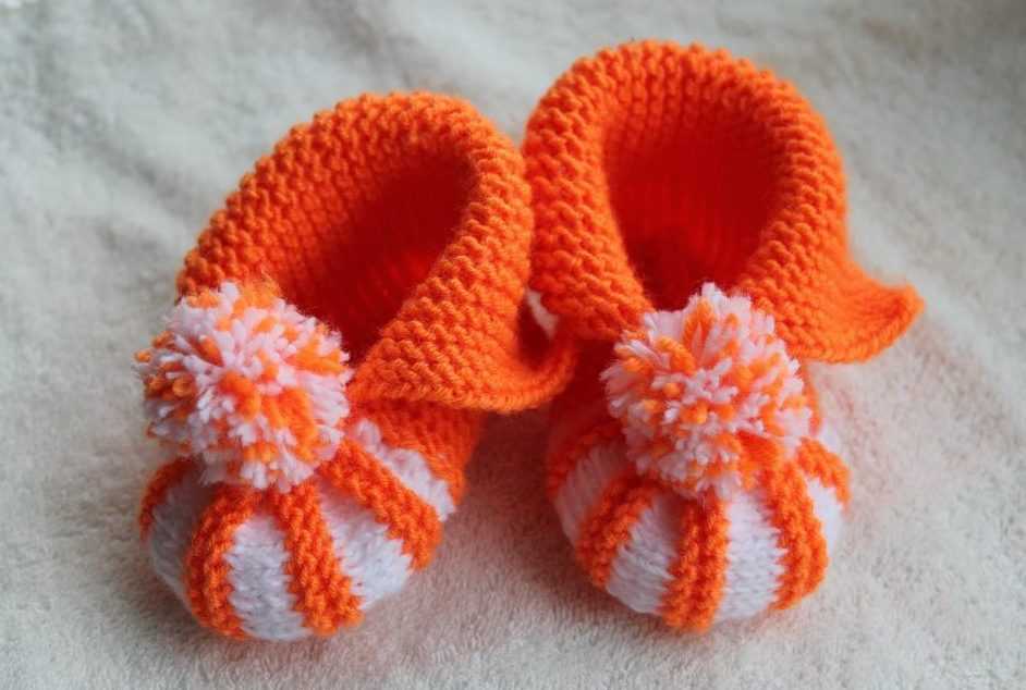 Связанные тапочки-зефирки спицами внешне очень простые, но привлекательные. Задняя их часть вяжется одним цветом, а передняя — рисунком ив виде сочетания полосок. Одна из них имеет контрастный оттенок. Другая же вяжется из той же пряжи, что и задняя часть. Разница полосок еще и в самой технике вязки. Одна выполняется лицевыми петлями, а другая — изнаночными. Получается, что вязание пинеток-зефирок выполняется платочным узором. Украшать изделия можно бусинами, бантиками или помпонами из пряжи.