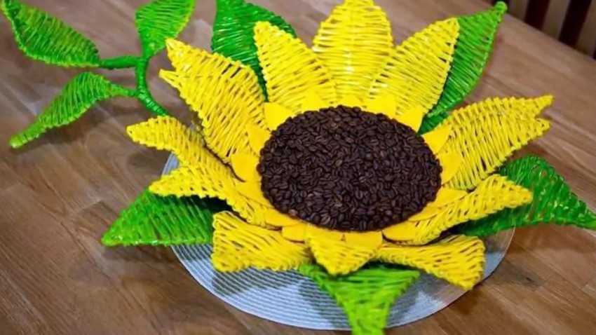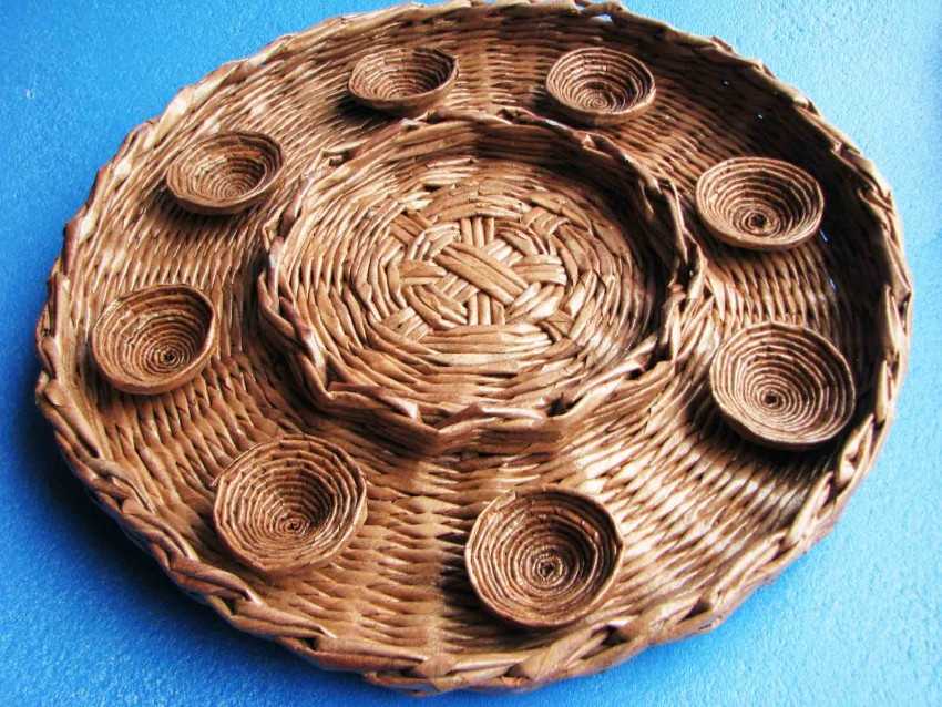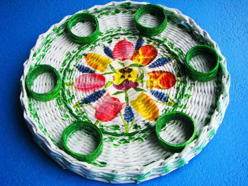 Изготовить её своими руками так же просто, как и декоративное блюдце или крышку. Для этой цели рекомендуется использовать плотные трубочки, сделанные из журнальных листов или качественной офисной бумаги. В этом случае конструкция прослужит достаточно долго. Способ плетения в процессе изготовления подставки можно выбирать любой.