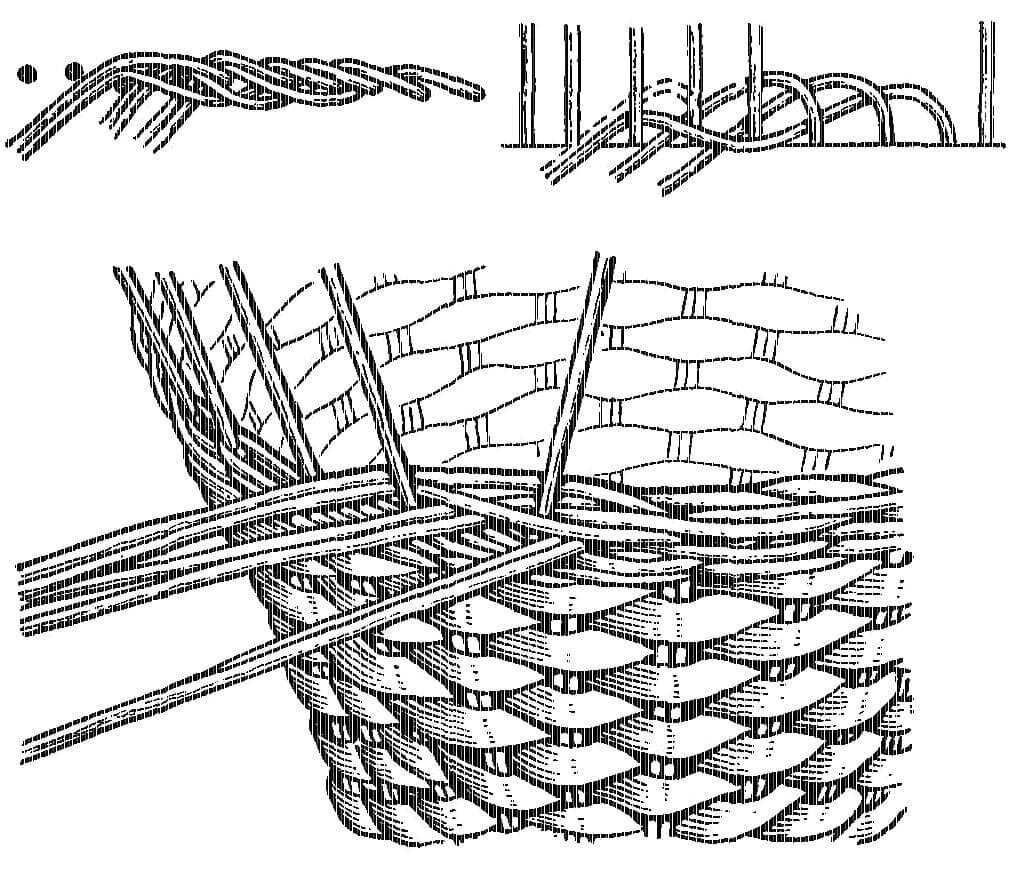 - Для оформления края корзинки стойки последовательно переплетаются с основной лозой и закрепляются с внутренней стороны при помощи клея.