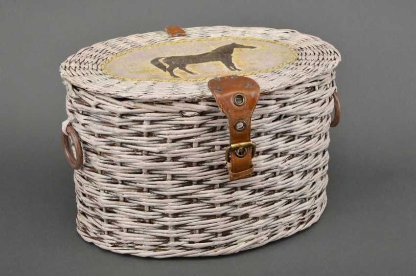 - Последний этап работы – декорирование изделия. Для этого корзину полностью покрывают акриловой краской и двумя слоями акрилового лака. После можно украсить корзину ленточками, бусинами, тесьмой и прочими аксессуарами.