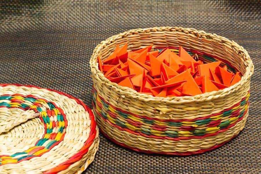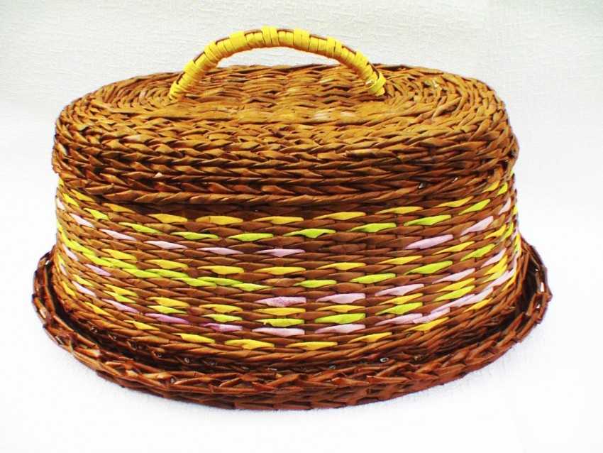 Красивая яркая корзинка, сплетенная опытным мастером из простых газетных трубочек