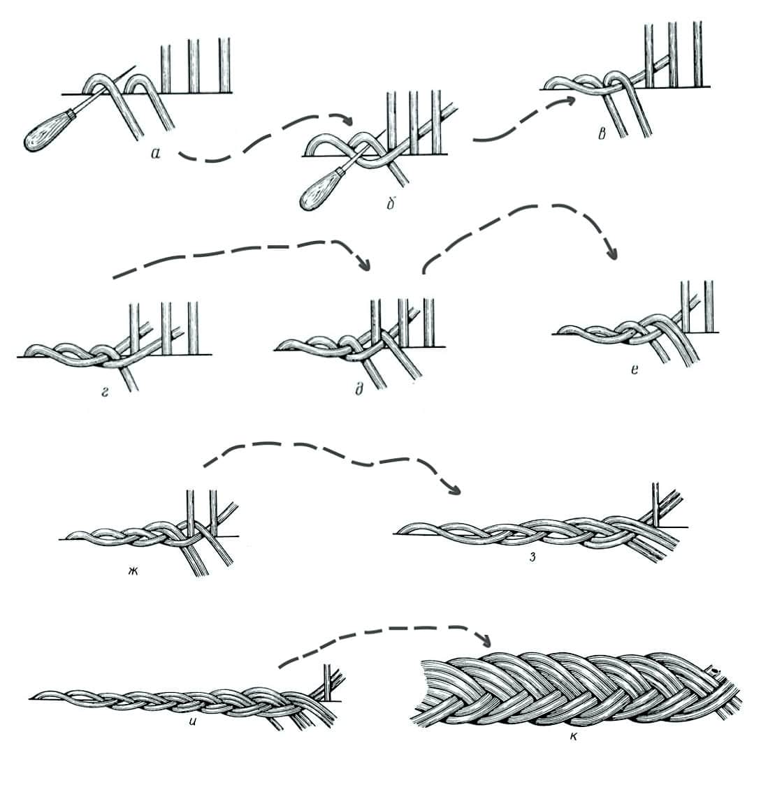 - Кромочные косички. Их следует плести из концов оставшихся стоек слева направо. Одну из трубочек сгибают наружу и загибают вторую, проводя под ней первую лозу. В конечном счете первая лоза выводится внутри и приклеивается.
