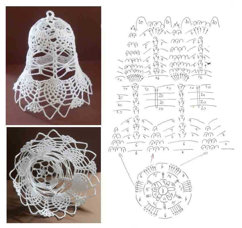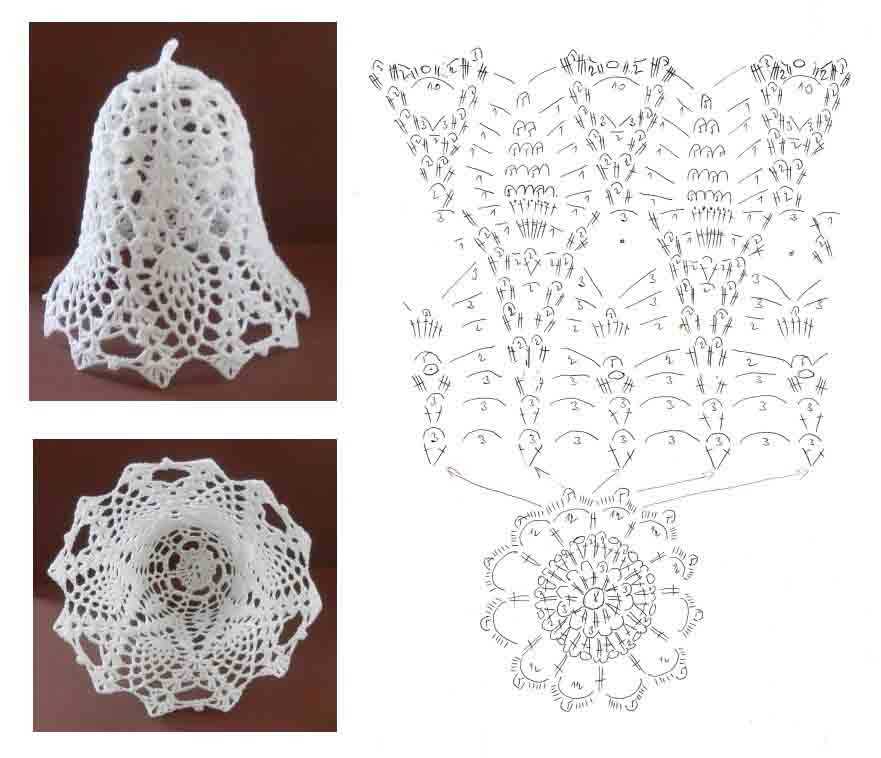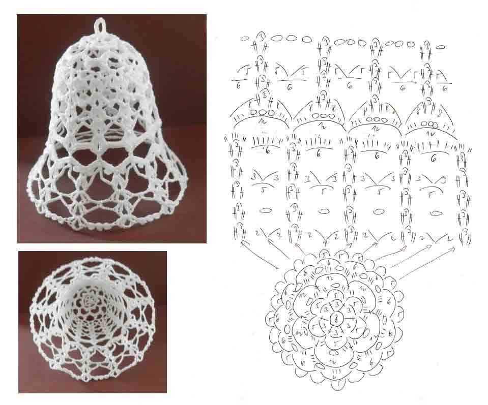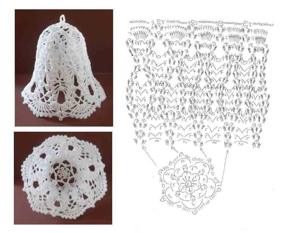 Пряжи надо совсем немного на одну штуку, так что пригодятся разные остатки, причем не обязательно белого цвета. Очень стильно и красиво будут выглядеть колокольчики, если пустить в некоторых рядах золотую ниточку. А можно и по готовому изделию сделать цветную вышивку.