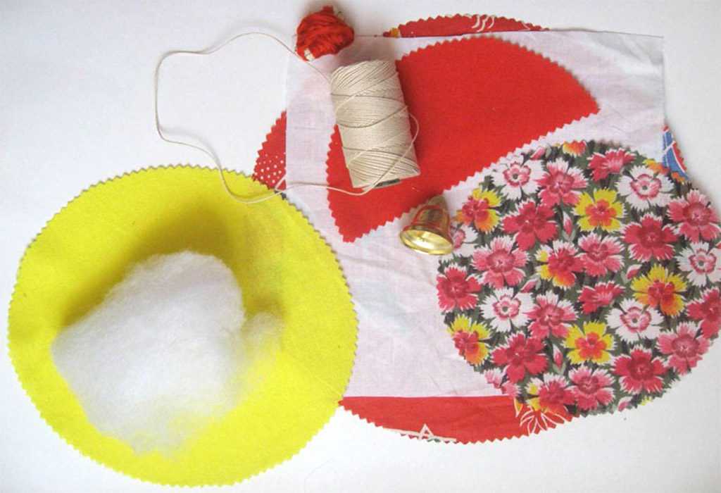 - 3 круга для сарафана, заранее вырезанные из яркой ткани разного цвета, диаметром 35, 32 и 30 см;