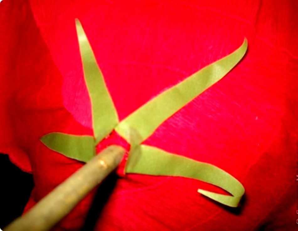 - Из зеленой бумаги вырезаем длинные тонкие листики, длиной до 10 см, и приклеиваем их снизу цветка.