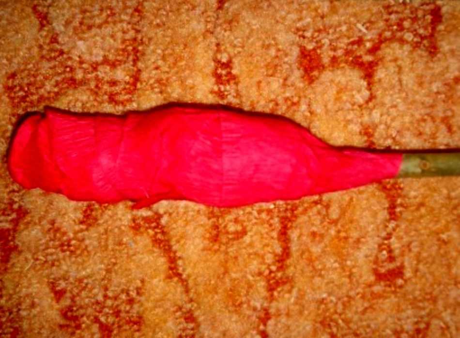 Два куска толстой проволоки обматываются специальной клейкой лентой. Затем формируется бутон. У основания размещают чашелистик. Листья поочередно крепятся к стеблю с помощью ленты.