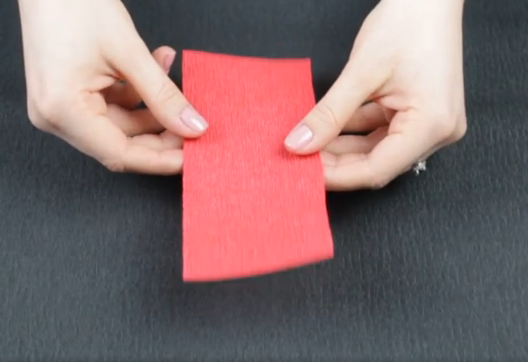 1. Вырежьте из бумаги красного цвета полоску шириной 7-10 см. Теперь один край подгибайте так, словно защипываете пирог.