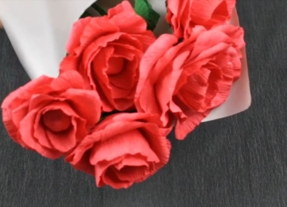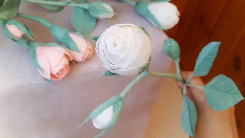 Далее смотрите мастер-классы немного иного порядка. В них распустившиеся розы, бутоны изготавливаются из крепированной бумаги. Она похожа на гофрированную, но не такая гибкая. Меньше тянется.