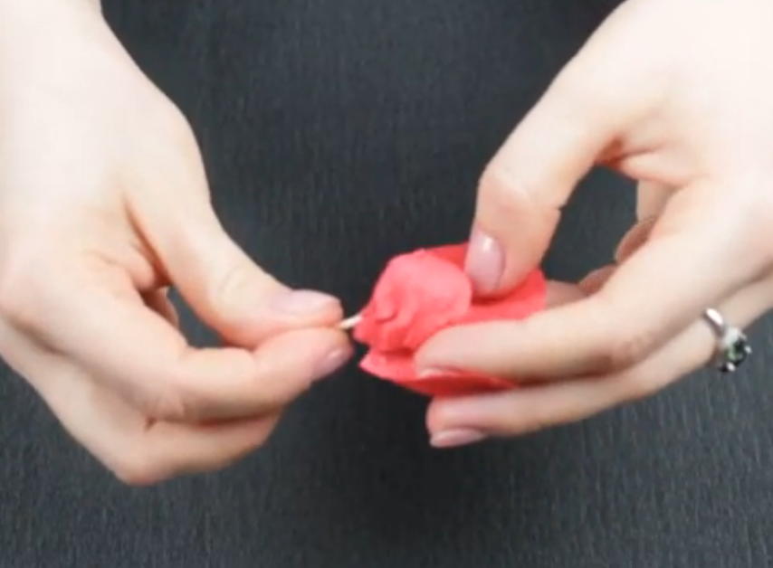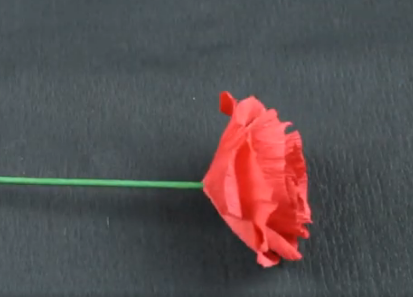 4. Получившуюся розочку насадите на проволочку и задекорируйте зеленой бумагой.