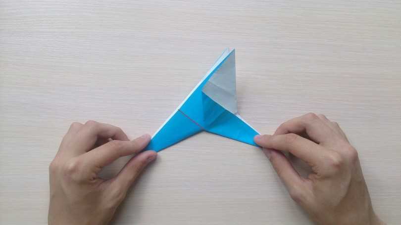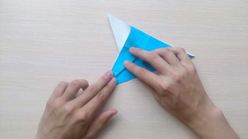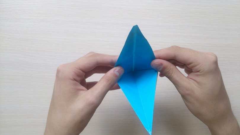 Для изготовления требуется большой лист бумаги в форме квадрата, на котором намечается центральная линия, и к ней подворачиваются боковые углы. Фигура напоминает вытянутый ромб. У треугольников, что составили его длинную часть, отгибаются внутренние углы, и фигура по срединной вертикали вновь складывается пополам.