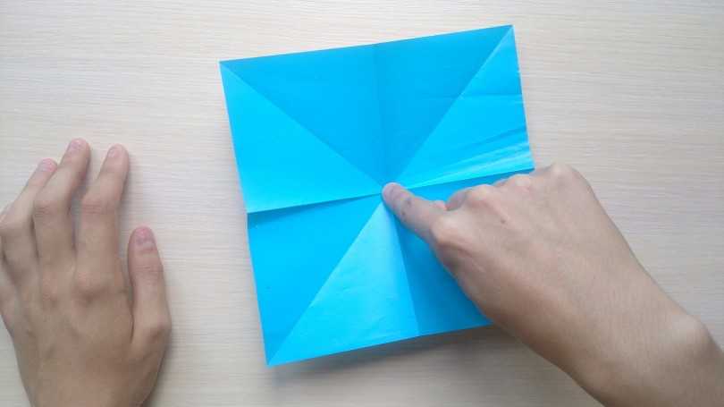 На первом этапе нужно сложить квадрат пополам в разных поперечных направлениях.