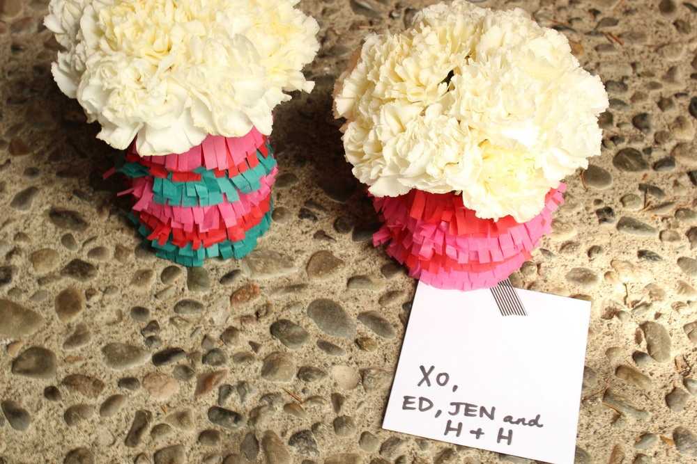 Чтобы задрапировать стеклянную поверхность, украсьте ее полосками бумаги с бахрамой. Можно использовать несколько схожих оттенков или наоборот, создать разноцветный микс из нескольких противоположных цветов. Наверх основы наклейте приготовленные цветы и листочки.