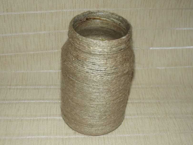 Сделать своими руками такое изделие несложно. Для этого может пригодиться даже кусочек мешковины, грубая канатная веревка, нотная тетрадь и красивая блестящая фурнитура. Из кусочка полотна отрезают необходимое количество, меряя длину и ширину по центральному диаметру банки. Полотном обматывают банку, фиксируя в двух местах специальным клеем.