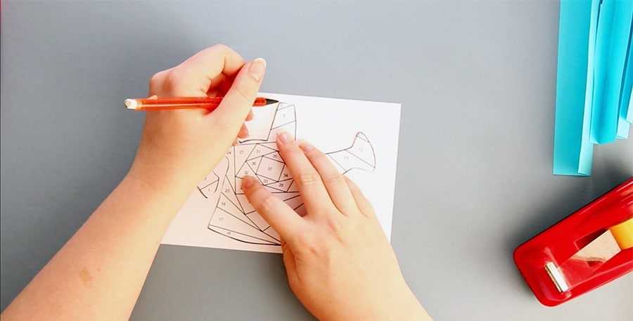 Затем каждый отрезок нужно пронумеровать, то же самое проделать с нарезанными полосками разноцветной бумаги. После этого можно приступать к приклеиванию отрезков бумаги на шаблон. Сначала приклеиваем крупные отрезки бумаги, затем мельче и так до самого маленького. Скрепляем все отрезки в середине квадратным кусочком бумаги. Затем переворачиваем и по контуру вырезаем, избавляясь от излишков цветной бумаги.