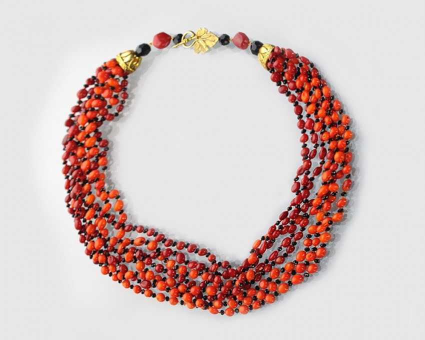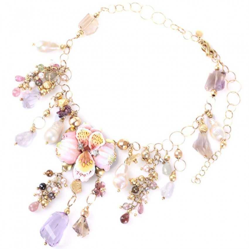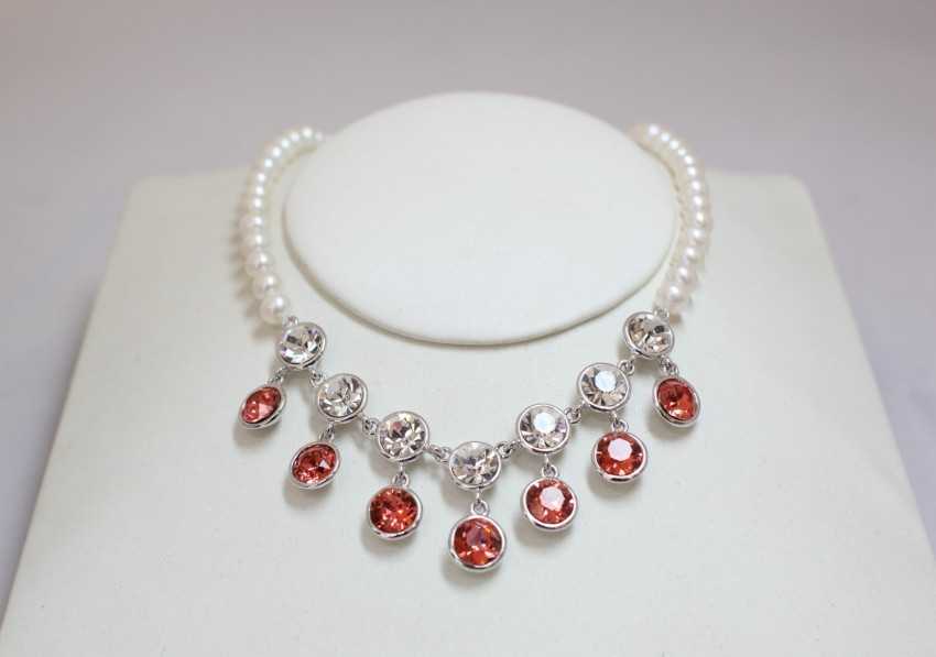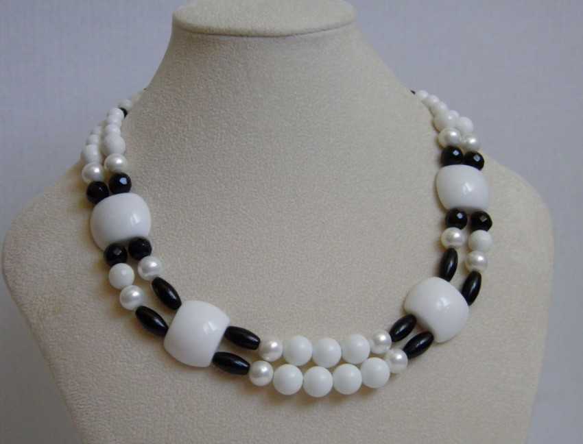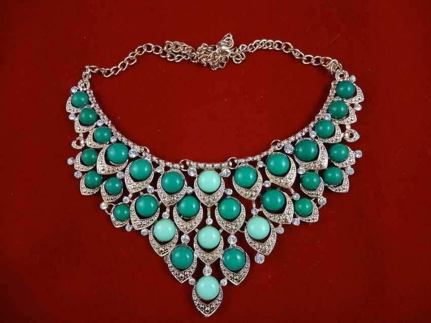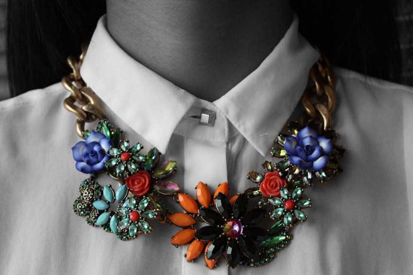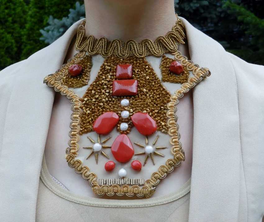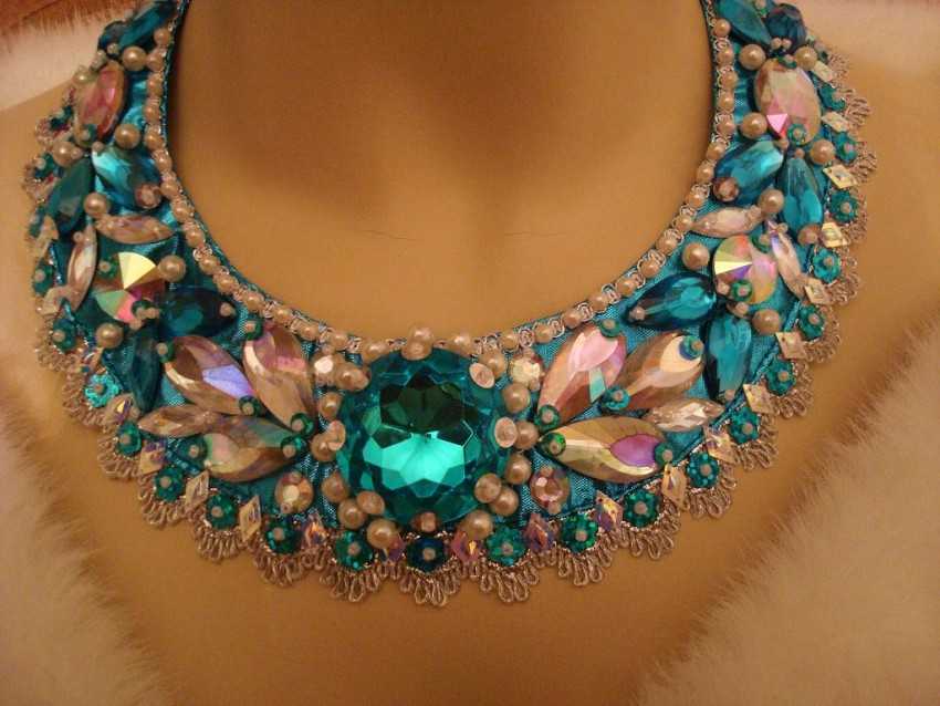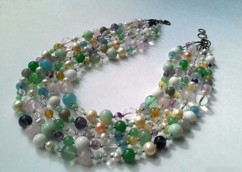 - По цвету. Если колье, ожерелье изготавливают в разных тонах, то учитывают их сочетаемость. Так, белый оттенок совместим с любой гаммой, оранжевый плохо смотрится с голубым и т.д.