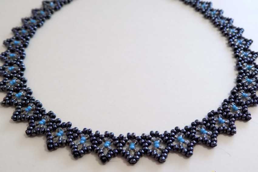 Ожерелье состоит из 6 рядов: 5 основных и последнего, который служит для фиксации получившихся волн. От того, какого размера должно получиться изделие, зависит правильно выбранная продолжительность первого ряда. Например, если готовое изделие должно быть длиной 45 см, то первый ряд необходимо сплести длиной в 60 см (15 см уйдут на волнообразную форму).