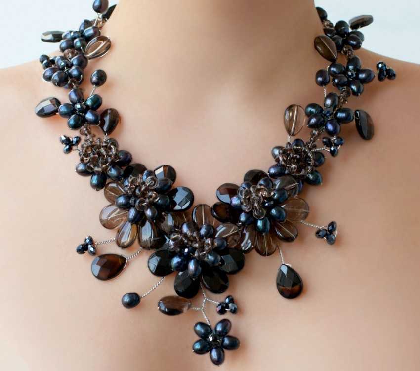Черное ожерелье в технике огалала подчеркнет роскошь вечернего наряда