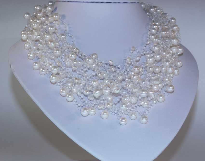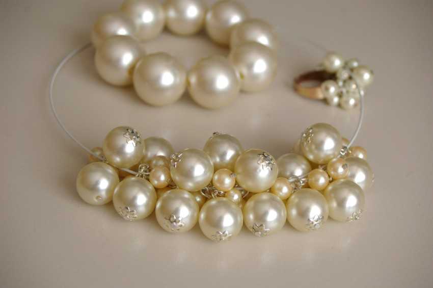 Однако работа с жемчугом имеет ряд особенностей, про которые следует помнить. Лучше всего в качестве основы для колье из жемчуга подойдёт нейлоновая леска или особая шёлковая нить. От использования ювелирного тросика лучше отказаться т.к. он может вызвать внутреннюю коррозию металла.