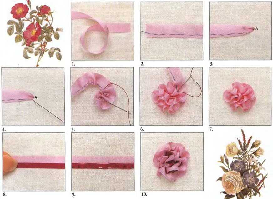 Розовые бутоны из лент можно делать несколькими способами. В данном случае используется простой, но очень эффектный вариант, позволяющий создавать экземпляры любого размера и степени открытости.