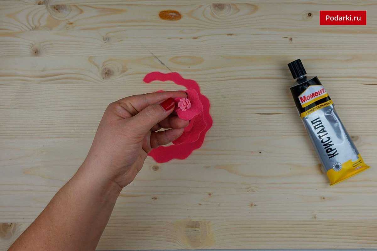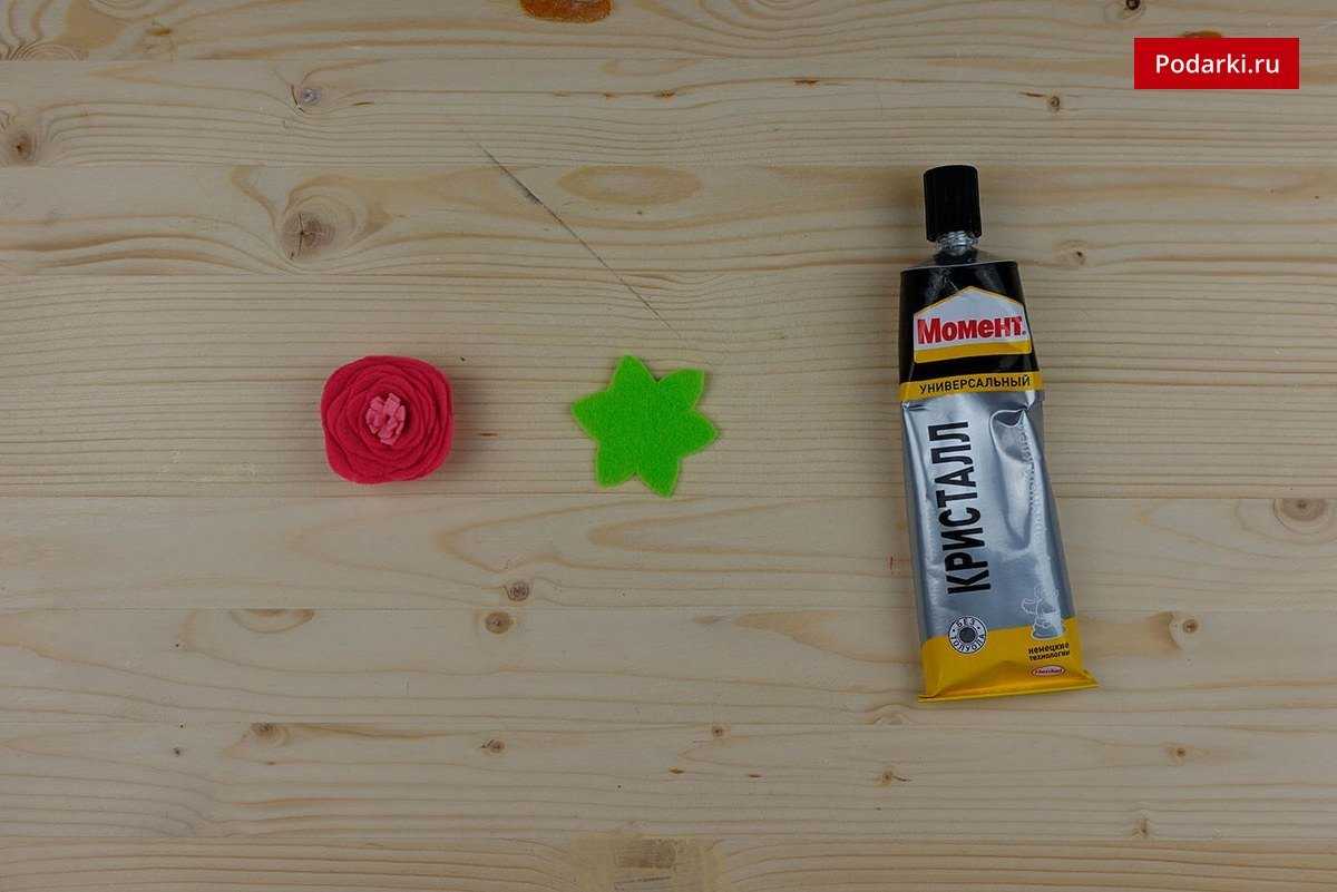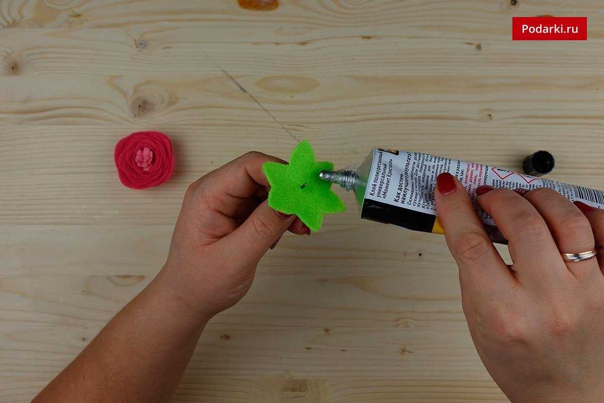 Теперь приклейте листочки и сам цветок горячим клеем на кружок из фетра