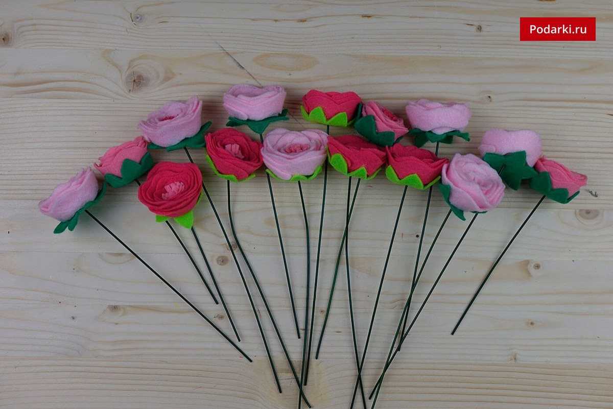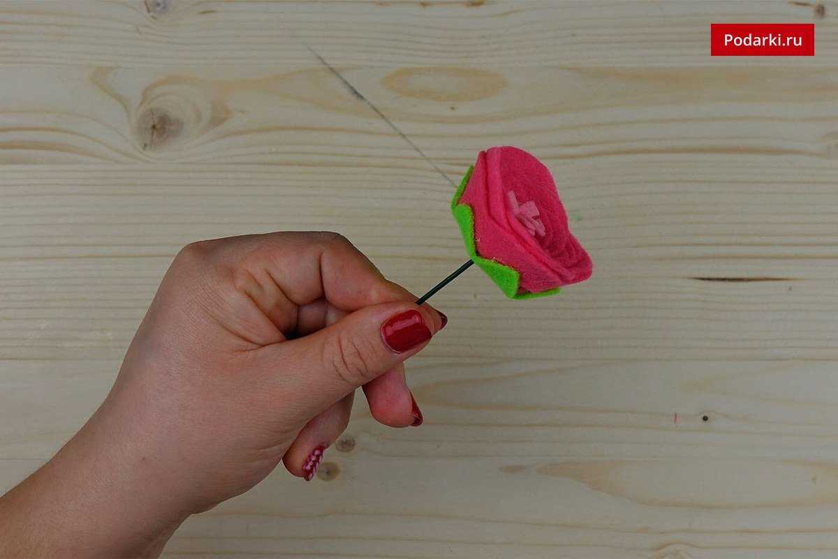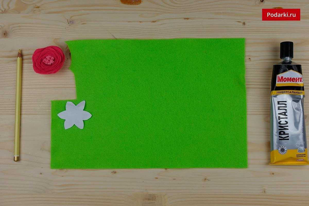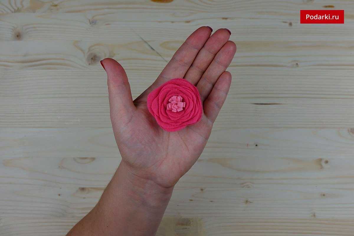 Теперь приклейте листочки и сам цветок горячим клеем на кружок из фетра