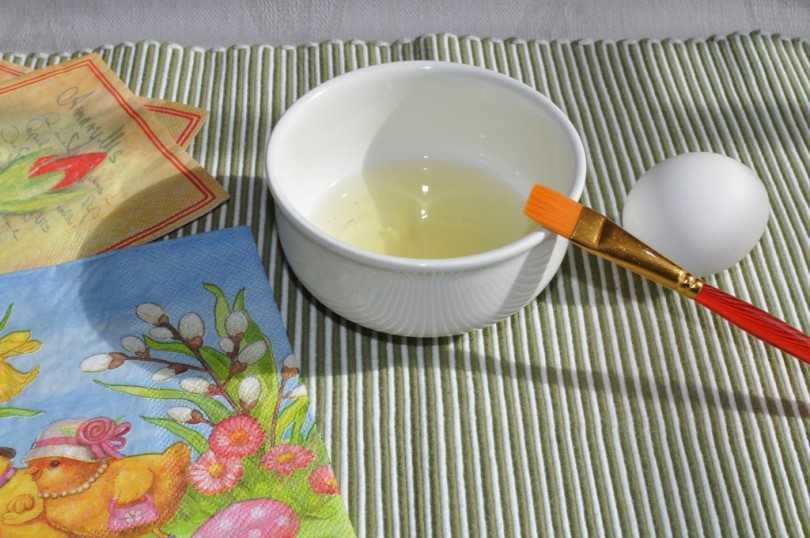 Но все же самым простым и безопасным клеящим средством для декупажа вареных яиц является яичный белок.