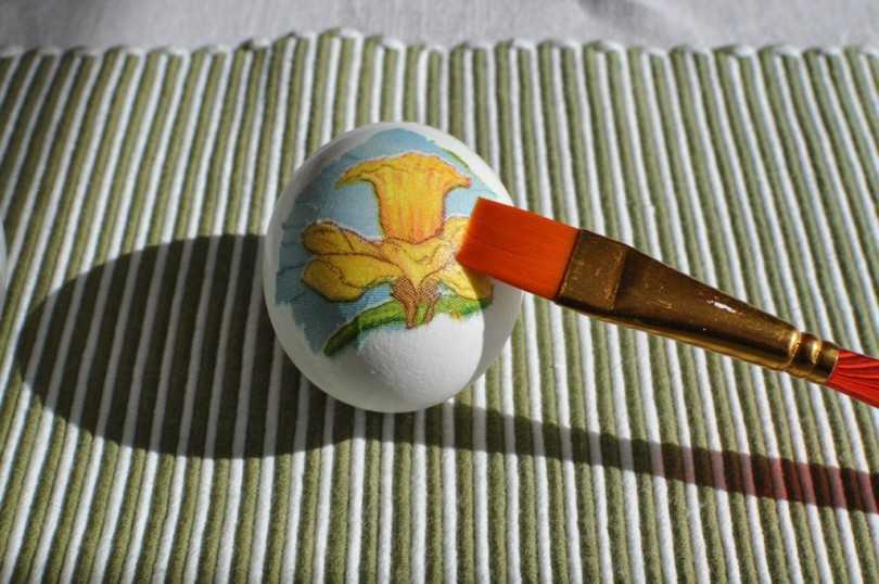 - Нанесите клей для декупажа на яйцо и обратную сторону рисунка, затем быстро наложите и расправьте рисунок.