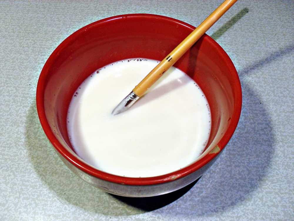Клей на желатине делается просто: порошок заливают водой в пропорциях, указанных производителем, и размачивают. Затем раствор процеживается и нагревается, пока гранулы полностью не растворятся. Что касается процедуры нанесения, то она ничем не отличается от технологии покрытия белком.