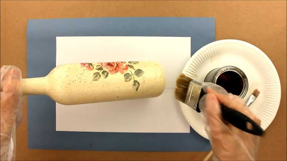 - Приклейте изображение на бутылку (можно использовать специальный клей для декупажа или акриловый лак). Расправьте складочки, дайте клею высохнуть.
