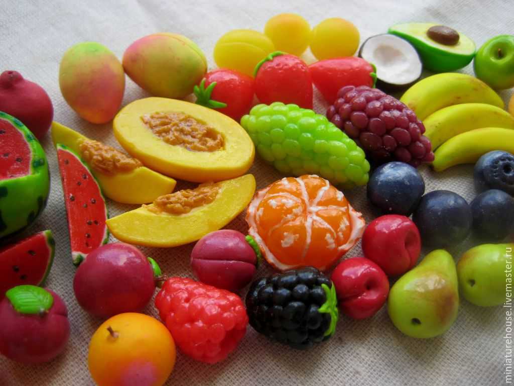 Овощи и фрукты из теста создавать легко. Дети часто их используют для игры с куклами – в виде еды. При создании таких фигурок стоит подбирать окраску, похожую на естественную, так кукольная еда будет похожа на настоящую.