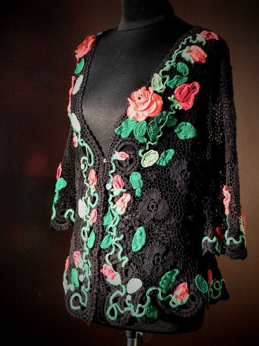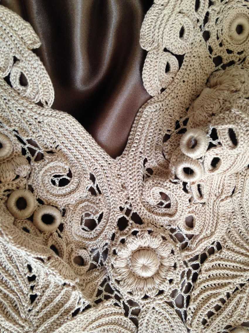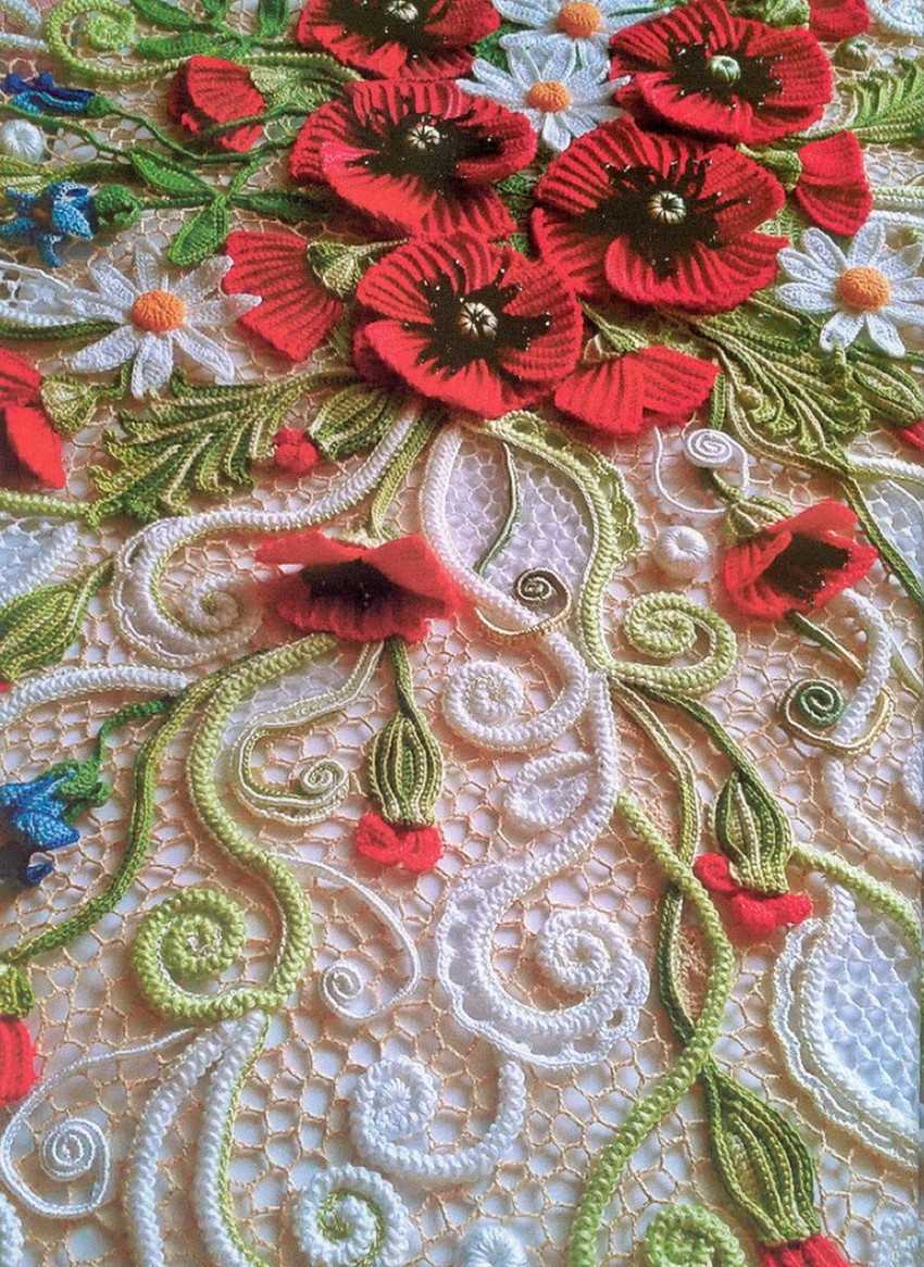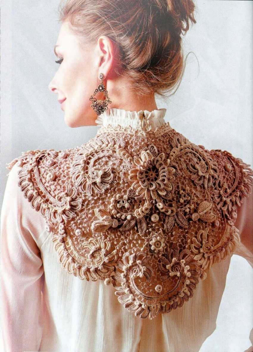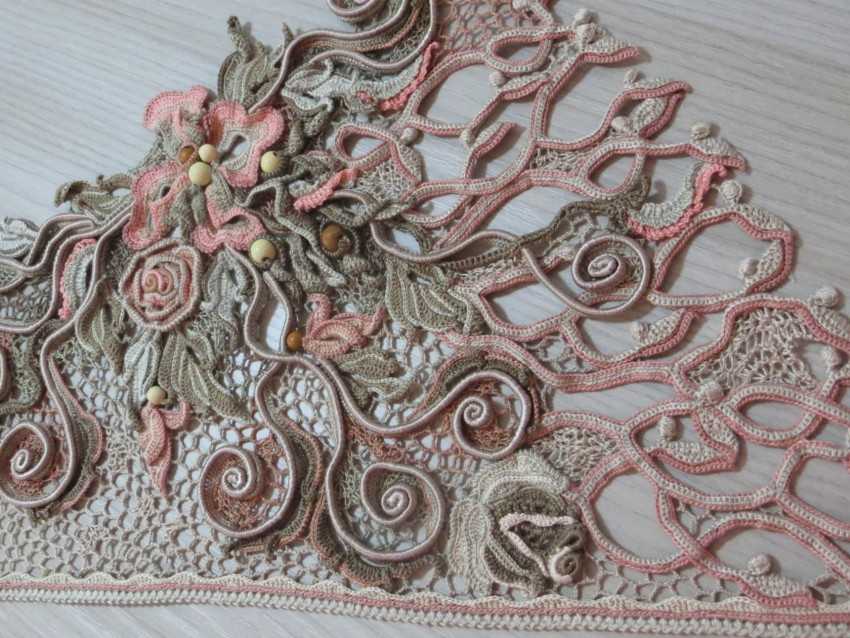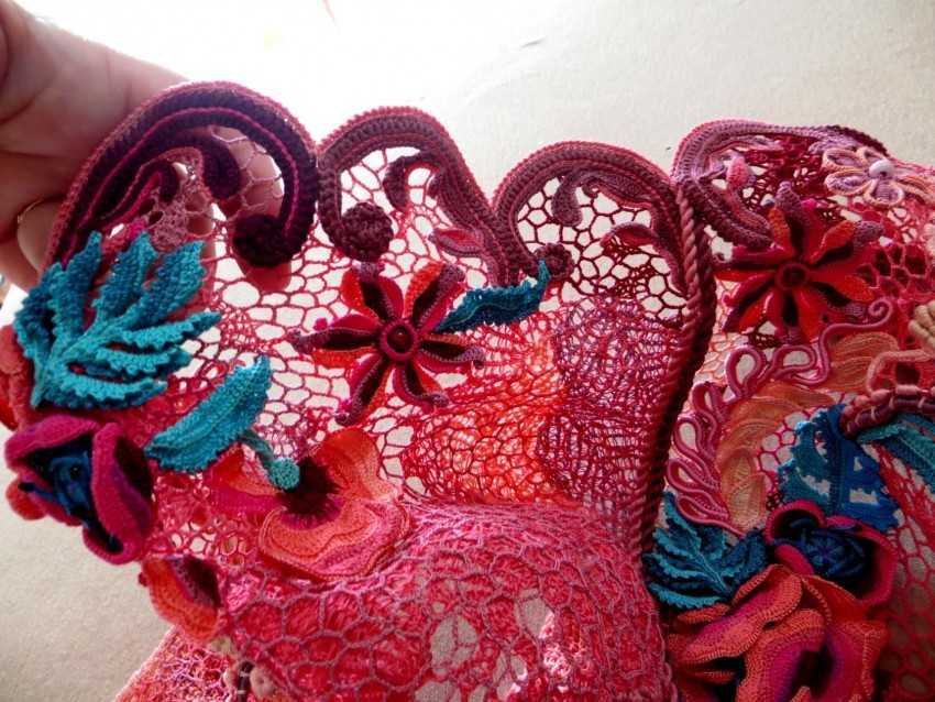Мастерицы творят кружевные изделия из чудных сплетений растительных узоров, удивляя необычностью и тонкостью кропотливой работы рукодельниц, творящих ажурные композиции крючком. Методика создания орнаментов разнообразна, много способов, но итог поражает уникальностью и ажурностью создаваемого рисунка. Одежда, изготовленная в этом технике, выглядит нарядно и экстравагантно.