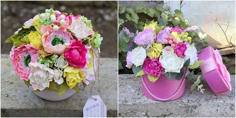 - Бумажная или картонная коробка. После покупки одежды, обуви или конфет в доме остаются красивые коробки, которые жалко выбросить. Если внешний край картонного изделия задекорировать при помощи ткани или нарядных салфеток в технике декупаж, то получится эксклюзивный элемент, который подчеркнет красоту цветочной композиции. В квадратных и прямоугольных больших коробках красиво смотрятся композиции, состоящие из цветов, фруктов, бутылки дорого алкоголя, шоколадных конфет ручной работы.