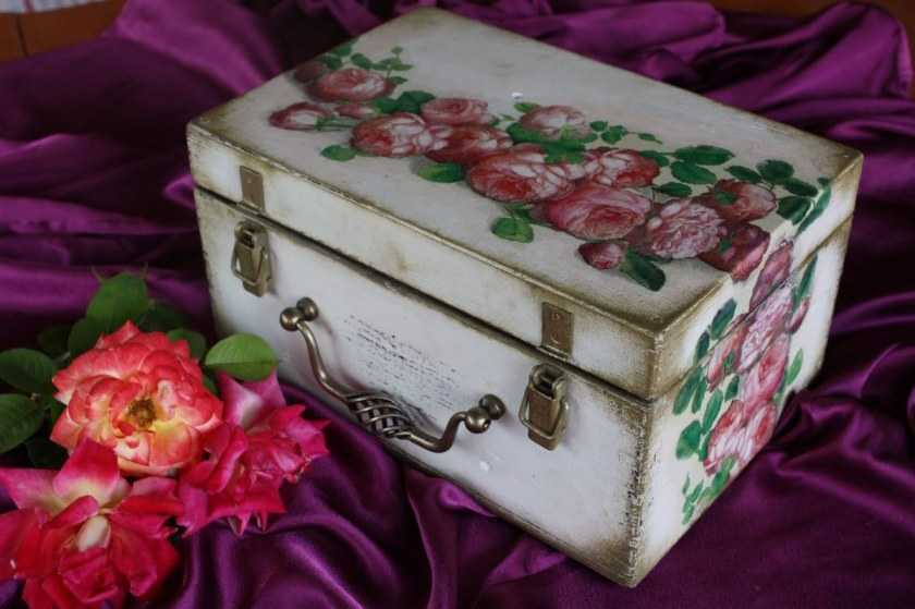 - К высохшей поверхности приклеить цветы на разведенный клей ПВА — на одну часть воды взять две части клея. Сначала покрыть цветами крышку, затем, после высыхания, по очереди боковые части.