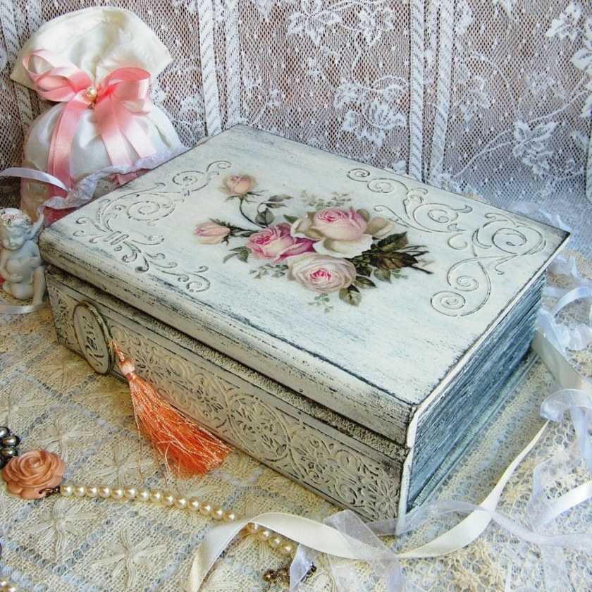 Оклей старую обувную коробку кусочками обоев, ткани, упаковочной бумаги или просто красивыми салфетками. Вырежи из картона разделители, оклей их тоже и вложи внутрь – это будут секции для разных мелочей. Укрась шкатулку снаружи аппликацией, цветами, бусинами, фурнитурой и лентами.