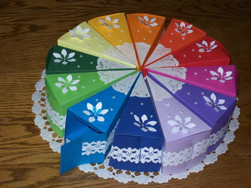 Поделки из бумаги на день рождения, пожалуй, самые популярные. Для торта понадобятся две картонные или жестяные круглые коробки с крышками (можно взять емкости из-под печенья или купить готовые в магазине подарков), цветная бумага, клей, атласные ленты или тесьма, батончики Kinder и небольшой покупной подарок — машинка, набор фломастеров, игрушка из лего. Коробки можно будет в дальнейшем использовать повторно.