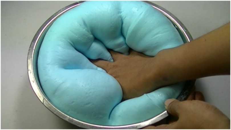 Начинаем выпаривать его на плите ориентировочно 2-3 минуты, параллельно не прекращая помешивать. Можно выпарить в СВЧ в течение 20 секунд. Требуется дождаться, чтобы вещество чуть остыло, отправив его охлаждаться. Чтобы слайм не приставал к ладоням, его можно чуточку смазать выбранным маслом!