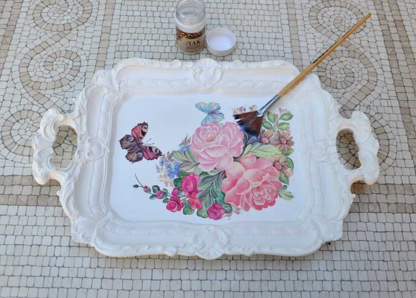 Покрыть наклеенный фрагмент лаком (только фрагмент, не всю внутреннюю поверхность тарелки). Оставить до полного высыхания.