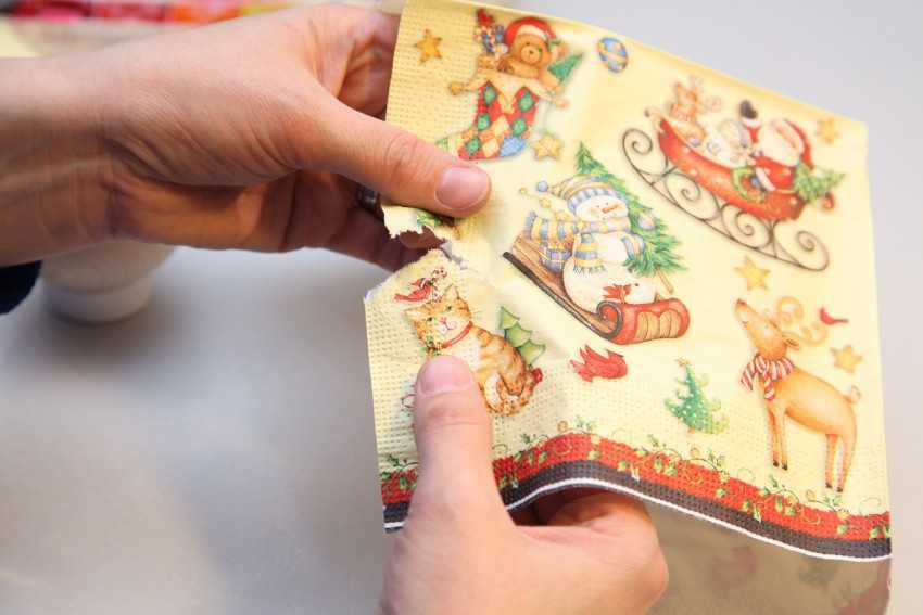 - вырезаем фрагменты салфетки, которые мы выбрали для декорирования, отделяем самый верхний слой;