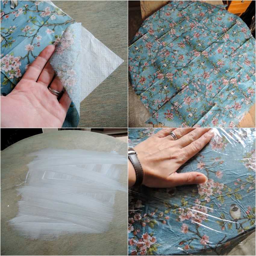 - Разглаживание рисунка от краев к центру. В этом случае на нем образуются складки. Это заметно с салфетками, поскольку они мягкие и тонкие. Приклеивая рисунок, работайте исключительно от центра к краям;