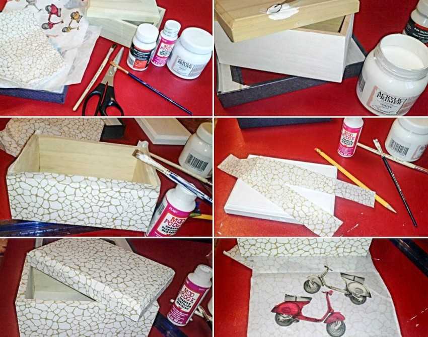 Потребность в тех или иных вспомогательных средствах и инструментах диктуется конкретной целью мастера, а точнее, предметом, с которым он имеет дело. Начинающим творцам не рекомендуется сразу же переходить к ценным экспонатам постигать азы декупажа и оттачивать базовые навыки лучше на простейших объектах — картонных коробках или деревянных пластинках (при необходимости заготовки легко найти в рукодельных магазинах).