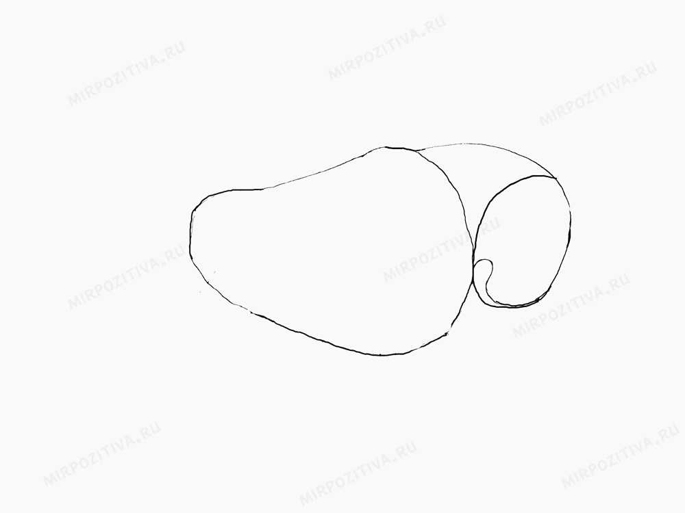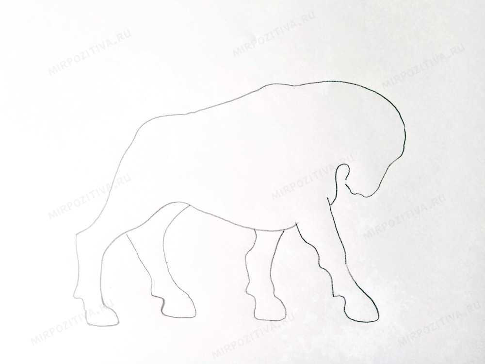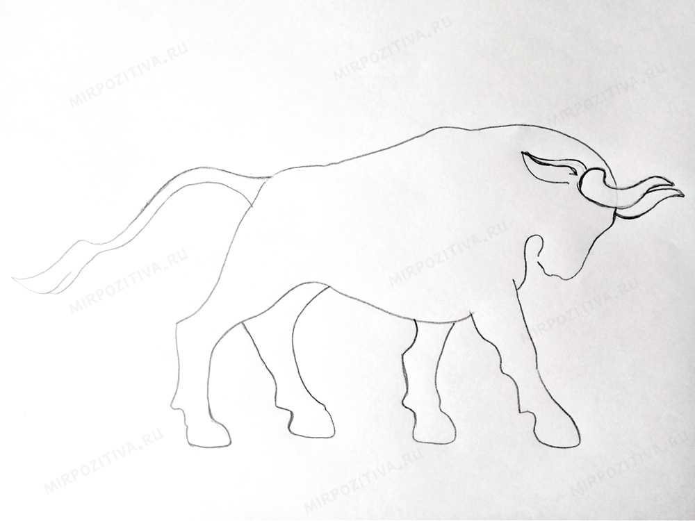 На первом этапе нарисуйте туловище быка с крупной передней частью, сужающейся к хвосту. Сбоку изобразите овальную голову, наклоненную вниз. Соедините обе части дугой — это будет шея. Прорисуйте морду.