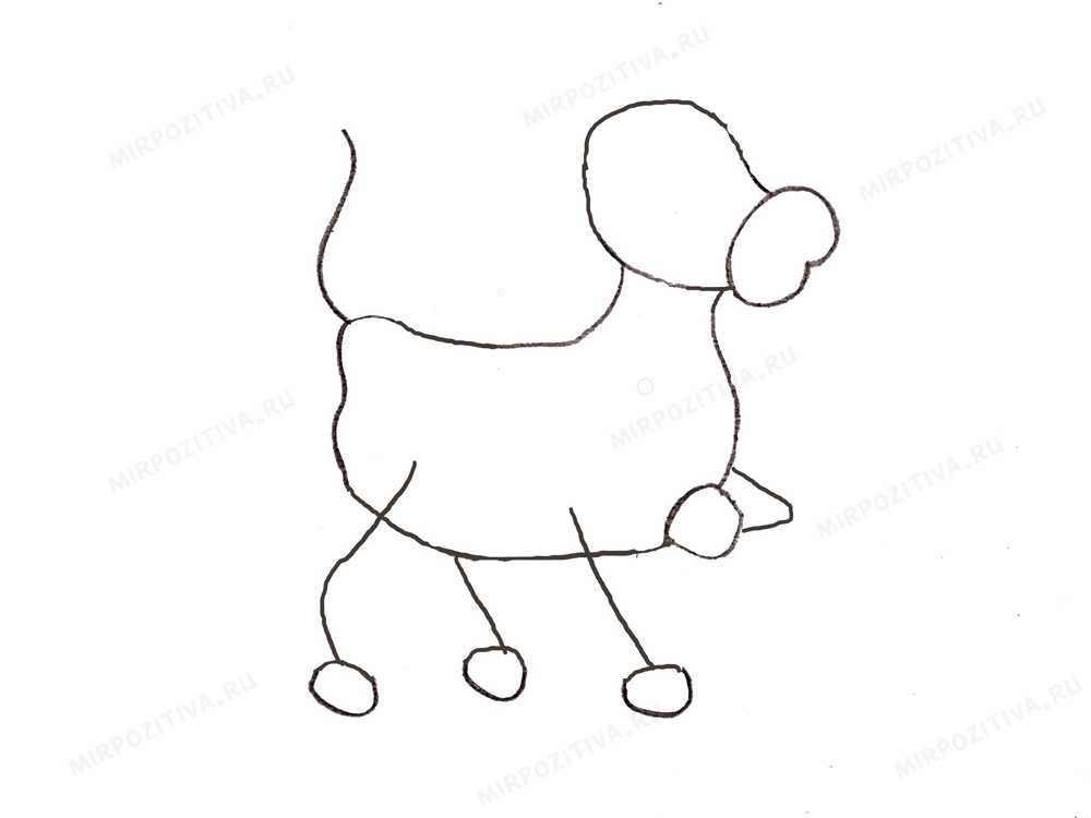 Оформите толщину ног: вверху они более объемные, чем внизу. Сотрите линии построения, исправьте ошибки и подробно обозначьте контур.